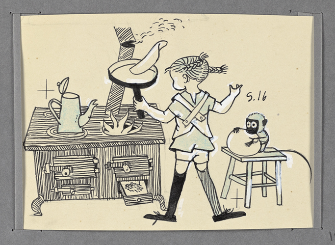 提供金子的父親,和上世紀(jì)四十年代漠視孩子的情感與游戲需求的許多父親一樣,養(yǎng)家卻不在家。皮皮強(qiáng)大的表現(xiàn)下有深刻的孤獨(dú)。不受約束的猴子和她的個(gè)性呼應(yīng),也是心理的陪伴 。她的力量、任性和幽默成了直面現(xiàn)實(shí)傷痛的矛和盾。