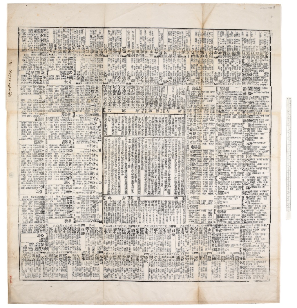 回到主題,就是牛津大學(xué)所藏這幅升官圖(Bodleian Library Sinica 440/2)。這幅圖為雕版印刷品。據(jù)牛津大學(xué)蘇諾教授見(jiàn)告,該圖原著錄為《升官圖》,題明倪元璐作。清道光庚子(1840)廣東刊。大小為82x75厘米,有“張隆盛制”朱文印記。1877年入藏,由曾駐扎香港的英軍98步兵團(tuán)的Lawrence Shadwell將軍捐贈(zèng)。本圖最中心位置說(shuō)明文字的落款為“道光庚子孟冬朔翻刊”,可以知曉本圖並非創(chuàng)制,而是翻刻前人所作而成。但既然是道光時(shí)候翻刻,說(shuō)明本圖所錄,當(dāng)為清代官制。整張圖由五塊雕板拼接而成。以此說(shuō)明文字為中心,其上下兩條各為一塊板,說(shuō)明文字所在之最中心為一塊板,左右兩邊又各一塊板。正是因?yàn)檎麍D是拼接而成,所以在印刷上存在一定的技術(shù)要求,稍有不慎,便會(huì)發(fā)生文字重疊或者模糊現(xiàn)象。本圖中左部分(以說(shuō)明文字為參照)文字多有重影,便是在印刷時(shí)版片沒(méi)有對(duì)齊壓實(shí)而造成的失誤。本圖文字共分上下左右四個(gè)方向,分別據(jù)各方向來(lái)閱讀。因此之故,即便是同一塊板子,其上所刻文字方向也有不同,如最下一條版中,就有向下,向左、向右三種方向的文字。而這無(wú)疑增加了很多刻版的難度。本圖雖然是一張平面圖,但顯然是借用了很多書(shū)籍的元素,如除了利用板框本身來(lái)分割不同部分之外,還借用了書(shū)籍中常用的黑魚(yú)尾來(lái)進(jìn)行分類(lèi),令版面顯得清晰而活潑。