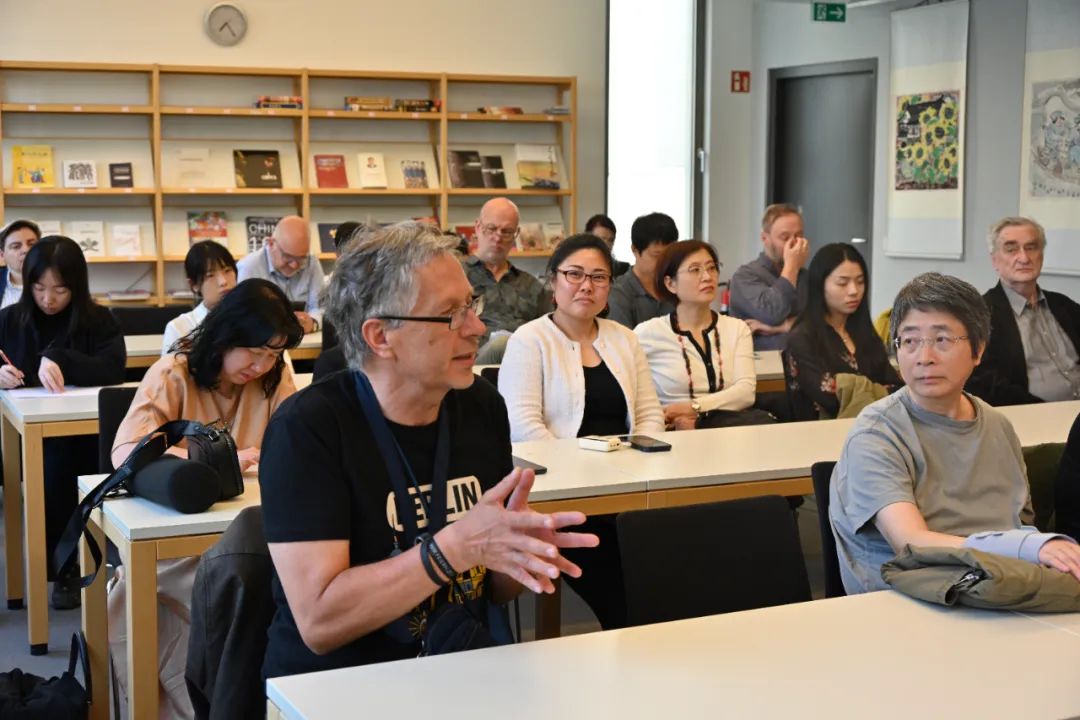 在詩(shī)歌鑒賞活動(dòng)的最后,進(jìn)入了熱烈而富有深度的互動(dòng)交流環(huán)節(jié)。來(lái)賓們圍繞中德語(yǔ)言間的可譯性、屈折語(yǔ)和分析語(yǔ)的表達(dá)差異、文化與詩(shī)歌節(jié)奏的異同,以及中國(guó)現(xiàn)代詩(shī)歌與古典傳統(tǒng)之間的承續(xù)與轉(zhuǎn)化展開(kāi)了積極討論。在場(chǎng)的詩(shī)人們也紛紛分享了他們?cè)趧?chuàng)作中如何面對(duì)語(yǔ)言邊界、文化背景與表達(dá)方式的挑戰(zhàn)。