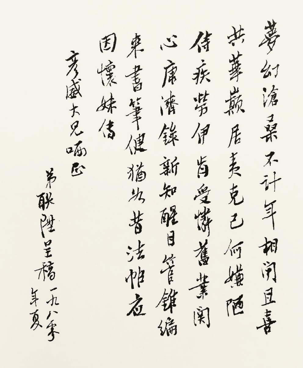 “夢幻滄桑不計年,相聞且喜共華巔。居夷克己何嫌陋,侍疾勞伊肯受憐。舊業(yè)關(guān)心康濟錄,新知醒目管錐編。來書筆健尤如昔,法帖應(yīng)因懷妹傳?!薄逗蛷┩帧罚?980年7月11日。(繆鉞,字彥威,歷史學家、中國古典文學家,四川大學教授,也是楊聯(lián)陞妻繆鉁之兄。)
