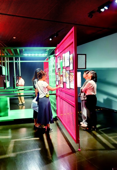 香港單元的主題為“香港快拍·城市漫步”,呈現(xiàn)了四組由香港青年藝術(shù)家們創(chuàng)作的具有非遺元素的視覺藝術(shù)作品。四組作品靈感分別源自廣州彩瓷技藝、香港長衫、傳統(tǒng)活版印刷和香港街頭的盒子形攤子。“看到這些霓虹燈和港式盒仔檔,就像來到了香港中環(huán)街市?!爆F(xiàn)場觀眾田女士觸景生情。