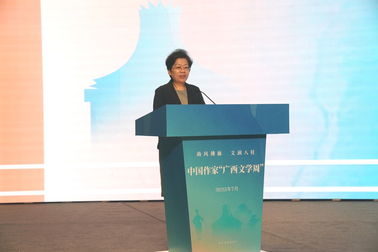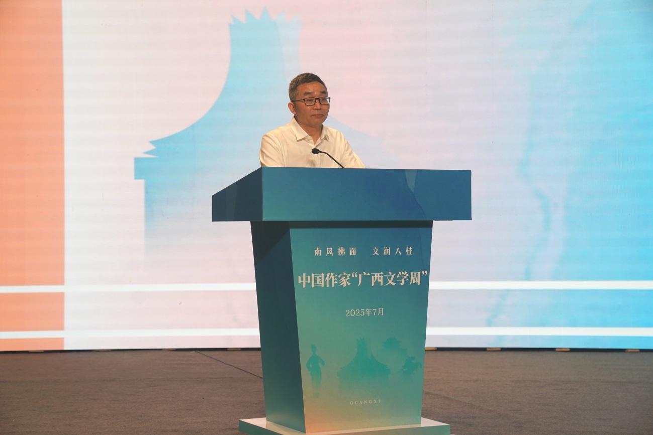陳奕君在講話中說,從廣西作家東西首獲茅盾文學(xué)獎(jiǎng)、3名作家折桂第十三屆駿馬獎(jiǎng)的喜悅時(shí)刻,到“2024中國(guó)文學(xué)盛典?駿馬獎(jiǎng)之夜”系列活動(dòng)、廣西作家協(xié)會(huì)揭牌儀式的盛大場(chǎng)景,中國(guó)作協(xié)對(duì)廣西文學(xué)事業(yè)的支持如春風(fēng)化雨,早已融入八桂大地的文化肌理,為廣西文學(xué)搭建起連接全國(guó)的橋梁,推動(dòng)文學(xué)桂軍實(shí)現(xiàn)長(zhǎng)足發(fā)展和歷史性突破。本次中國(guó)作家“廣西文學(xué)周”的舉辦,必將進(jìn)一步激發(fā)廣西文學(xué)創(chuàng)作潛力,激活文學(xué)創(chuàng)作氛圍,推動(dòng)廣西作家立足廣西,放眼全國(guó),以更加開闊的視野和胸懷創(chuàng)作出更多佳作。同時(shí),這也是廣西作家提升自我水平,深度參與中國(guó)文學(xué)事業(yè),加強(qiáng)與全國(guó)文學(xué)工作者溝通交流的難得機(jī)遇。本次文學(xué)周最大的亮點(diǎn)就是以文學(xué)為紐帶,讓高端文學(xué)資源與基層文化需求實(shí)現(xiàn)精準(zhǔn)對(duì)接。希望廣西作家充分利用本次寶貴機(jī)會(huì),加強(qiáng)溝通交流、感知文學(xué)真諦、提升寫作技能,走向更為廣闊的文學(xué)天地。