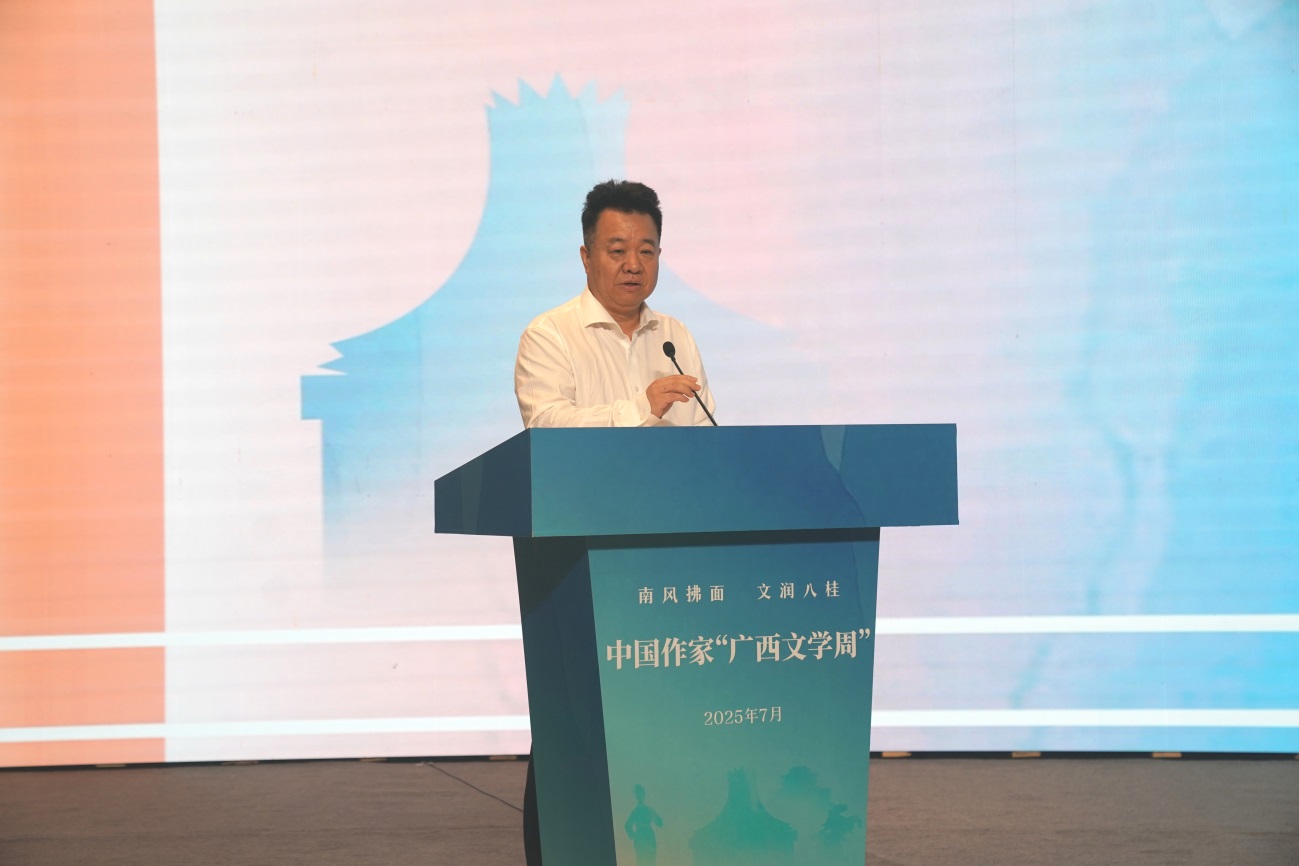 邱華棟在講話中表示,近年來,廣西文學(xué)創(chuàng)作氣象崢嶸,百花競(jìng)妍,“文學(xué)桂軍”崛起,逐鹿“高原”,形成了令人矚目的規(guī)模效應(yīng)。特別是去年“中國(guó)文學(xué)盛典?駿馬獎(jiǎng)之夜”舉辦暨廣西作協(xié)實(shí)現(xiàn)提級(jí)升格,為廣西文學(xué)發(fā)展注入了新的動(dòng)能。為貫徹落實(shí)黨的二十屆三中全會(huì)精神,特別是全會(huì)《決定》中“完善健全體系,建立優(yōu)質(zhì)文化資源直達(dá)基層機(jī)制”的要求,堅(jiān)持不懈用習(xí)近平文化思想武裝頭腦、凝心鑄魂,今年舉辦中國(guó)作家“廣西文學(xué)周”,希望在這片文學(xué)的沃土上,通過文學(xué)公共服務(wù)和志愿服務(wù)的“精準(zhǔn)滴灌”,將更多優(yōu)質(zhì)文學(xué)資源輸送到廣大文學(xué)愛好者和讀者身邊。