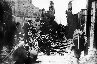 1938年初,為阻止日軍進攻,中國軍隊先后調(diào)集兵力與日軍展開徐州會戰(zhàn),并于4月上旬取得臺兒莊大捷。圖為中國軍隊與日軍在臺兒莊巷戰(zhàn)。