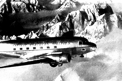 從1942年5月至1945年9月,絕大部分同盟國援華軍用物資自印度汀江通過“駝峰航線”運到昆明,共向中國運輸戰(zhàn)略物資80多萬噸。圖為在雪峰間穿行的C—47運輸機。