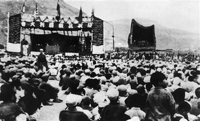 全民族抗戰(zhàn)爆發(fā)后,紅軍主力改編為八路軍,南方八省紅軍游擊隊改編為新四軍(瓊崖紅軍游擊隊除外)。正面戰(zhàn)場國民黨軍隊頑強抗擊日軍進攻,中國共產(chǎn)黨領(lǐng)導的人民抗日武裝向敵后實施戰(zhàn)略展開,開辟敵后戰(zhàn)場。圖為紅軍改編后舉行抗日誓師大會。