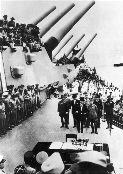 1945年8月15日,日本宣布無條件投降。9月2日,在東京灣的美國“密蘇里”號戰(zhàn)列艦上,舉行日本向同盟國投降簽字儀式。圖為日本投降簽字現(xiàn)場。