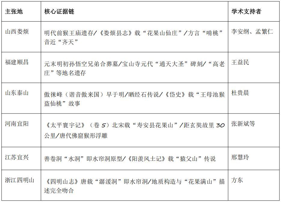 關(guān)于花果山的原型,學(xué)界有不同觀點,現(xiàn)將幾種學(xué)說譜系列表如下: