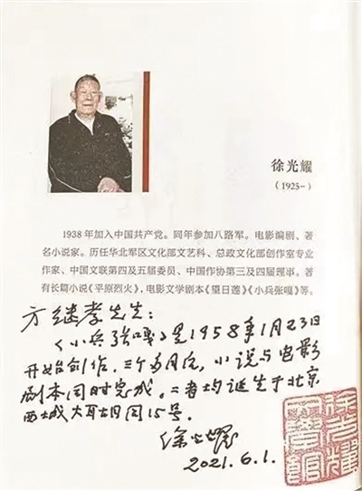 方繼孝回憶,他與徐光耀先生在30年前開始交往,并結(jié)下忘年交。起初引起他注意的是徐光耀1958年日記里的一句話,“從今天起,開始寫中篇小說劉故得兒的故事。”日記最后還有一句話,“張故得兒的故事已經(jīng)完成初稿。”方繼孝知道“故得兒”這詞在北京話里是“老疙瘩”“老兒子”的意思,在河北方言里還有調(diào)皮搗蛋的意思。《小兵張嘎》究竟是在哪里孕育出生的?方繼孝后來研讀《徐光耀日記》發(fā)現(xiàn),小說《小兵張嘎》初擬提綱時(shí)的名字叫“劉故得兒”。梗概完成后,改為“張故得兒”。最后定稿時(shí),書名《小兵張嘎》。2021年,徐光耀在紀(jì)念《小兵張嘎》公開發(fā)表60周年海報(bào)簽字并附贈(zèng)手書時(shí),向方繼孝確認(rèn),《小兵張嘎》是1958年1月23日開始創(chuàng)作,在北京西城延壽寺街的大耳胡同15號(hào)完成的。