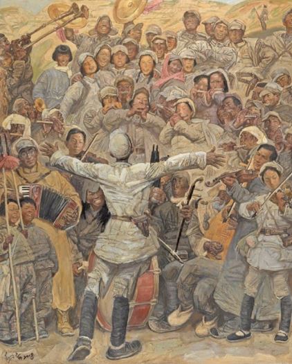 戰(zhàn)爭(zhēng)可以摧毀肉體,卻不能奪走對(duì)精神家園的守望。而這份堅(jiān)韌,終將使人性的火種于戰(zhàn)爭(zhēng)的鐵血洪流中得以頑強(qiáng)存續(xù),并轉(zhuǎn)化為民族不屈不撓、勇往直前的澎湃動(dòng)力。在抗戰(zhàn)美術(shù)畫卷中,還有另一種重要筆觸,記錄戰(zhàn)爭(zhēng)至暗時(shí)刻里的光明心火,以見證黎明必至的希望和夢(mèng)想。如邢慶仁的《玫瑰色的回憶》和高云的《還記得我們嗎》兩幅作品,都刻畫了年輕的八路軍、新四軍女戰(zhàn)士。她們身姿挺拔,戎裝陳舊卻整潔,充滿活力與憧憬,特別是軍帽之下那些紛揚(yáng)散落的碎發(fā),如青春靈動(dòng)的無聲訴說,提醒人們縱使烽火連天,也不能掩蓋她們花樣年華的芬芳,更無法奪走她們追求美的執(zhí)著。沈堯伊的《在太行山上》,描繪了軍民共奏歡歌的動(dòng)人場(chǎng)面。畫面正中,一位八路軍戰(zhàn)士正在指揮大家演奏,其張開的雙臂像要托起每個(gè)人的和平夢(mèng)想。在此,樂器與武器并置、山谷與旋律共鳴,軍民一起享受精神世界的豐饒。竇培高的《微山湖上靜悄悄》,捕捉了五位戰(zhàn)士在蘆葦蕩中短暫休憩的場(chǎng)面。戰(zhàn)士們有的凝望遠(yuǎn)方、有的彈琴吟唱、有的警惕四顧,但他們手中的槍和土琵琶都被微山湖的夕陽鍍上了溫柔的金色,正可謂:鐵血與溫情交織,劍膽與琴心并存。