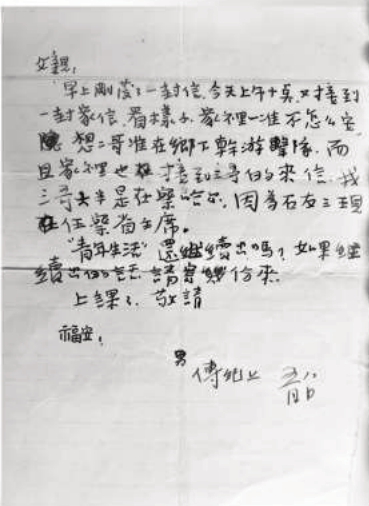 父親:早上剛發(fā)了一封信,今天上午十點(diǎn),又接到一封家信??礃幼蛹依镆粶?zhǔn)不怎么安(穩(wěn)),想二哥準(zhǔn)在鄉(xiāng)下干游擊隊(duì),而且家里也接到三哥的來(lái)信。我三哥大半是在察哈爾,因?yàn)槭讶F(xiàn)在任察省主席?!扒嗄晟睢边€繼續(xù)出嗎?如果繼續(xù)出的話,請(qǐng)寄幾份來(lái)。上課了,敬請(qǐng)福安!
