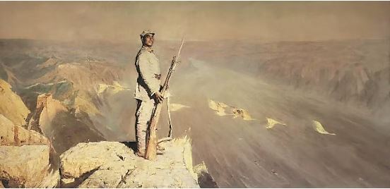 這種針對(duì)人物姿態(tài)的藝術(shù)修辭亦可見于《黃河頌》與《占領(lǐng)總統(tǒng)府》?!饵S河頌》以八路軍戰(zhàn)士為主體,描繪了抗戰(zhàn)期間八路軍戰(zhàn)士從容自信的姿態(tài)。背景中,凝結(jié)成線狀的黃河奔流于峽谷,呼應(yīng)了歌曲《黃河》的音樂性。《占領(lǐng)總統(tǒng)府》描繪渡江戰(zhàn)役后解放軍戰(zhàn)士攻入南京總統(tǒng)府、升起紅旗的場(chǎng)面。明暗法的使用強(qiáng)化了畫面的敘事性。光影與姿態(tài)的結(jié)合,使人自然聯(lián)想到浪漫主義畫家歐仁·德拉克羅瓦作于19世紀(jì)的《自由引導(dǎo)人民》。二者同樣憑借象征性的姿態(tài)與幾何構(gòu)圖,激發(fā)起觀者深刻的情感共鳴。