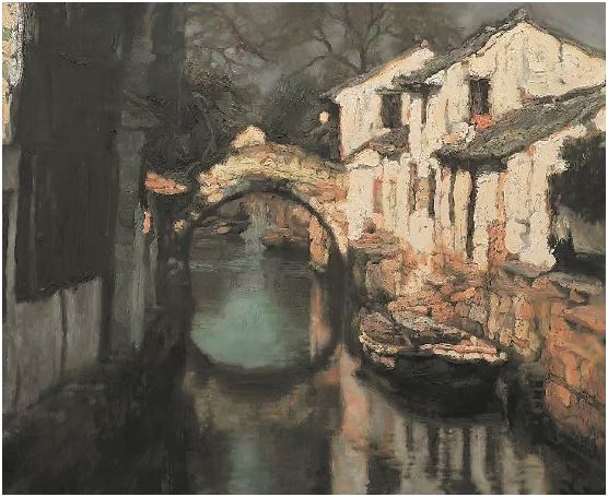 “視覺”這一文化建構(gòu)經(jīng)現(xiàn)代化發(fā)展之后,在人們的日常生活中愈發(fā)重要。隨處可見的視覺產(chǎn)品影響著人們的感知,陳逸飛曾將當(dāng)時(shí)的上海比作一座“視覺學(xué)?!薄T谒乃囆g(shù)語境中,這一概念有著幾重深刻的內(nèi)涵。首先,這座城市本身就是動(dòng)態(tài)的視覺教材。上海灘新舊并置的都市景觀天然訓(xùn)練著市民的視覺敏感性。正如陳逸飛在《海上舊夢(mèng)》系列中捕捉的,每塊磚石都鐫刻著東西方視覺文化的對(duì)話痕跡。其次,上海孕育了獨(dú)特的視覺教育機(jī)制。從月份牌廣告到老電影制片廠,從旗袍剪裁到梧桐樹影的光影游戲,城市通過日常細(xì)節(jié)持續(xù)傳遞著視覺教養(yǎng)。這種教育并非發(fā)生在傳統(tǒng)課堂,而是悄然滲透在咖啡館的玻璃反光中、蘇州河的水波褶皺里,潛移默化地培養(yǎng)著市民對(duì)色彩和構(gòu)圖的審美感知。作為一座真正的“視覺學(xué)?!保虾W詈诵牡膬r(jià)值在于其生產(chǎn)視覺認(rèn)知范式的能力。石庫(kù)門門楣的裝飾紋樣成為解讀社會(huì)階層的密碼,外白渡橋的鋼鐵結(jié)構(gòu)則成為理解現(xiàn)代性的媒介,這種視覺規(guī)訓(xùn)不僅塑造了海派文化獨(dú)特的審美辨識(shí)度,也為陳逸飛提供重構(gòu)歷史的圖像詞典——恰似他在《海上舊夢(mèng)》里巧妙調(diào)用的那些城市記憶碎片。