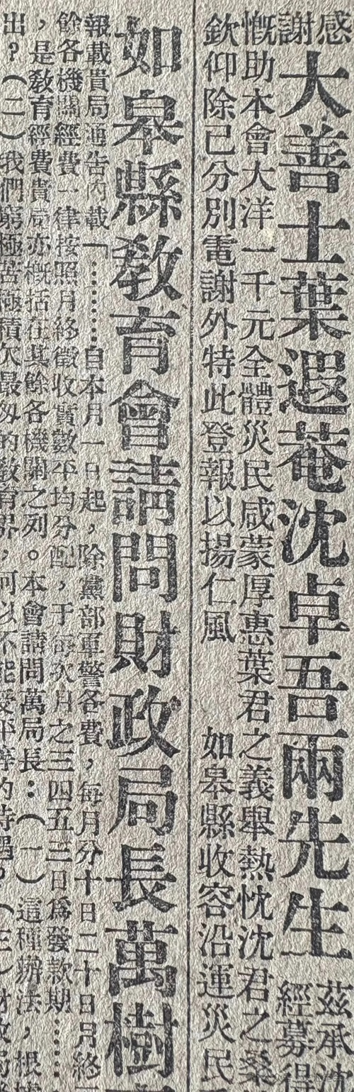 邑人沈卓吾,對于慈善事業(yè),素具熱忱。沈君近在上海向友人葉遐輝君募捐到大洋一千元,于昨日由如皋農(nóng)民銀行匯轉(zhuǎn),交本縣收容沿運(yùn)災(zāi)民委員會賑災(zāi)云。