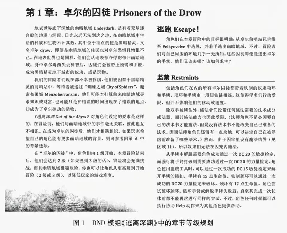 而這一點可被“模組”的興起證明。在升級系統(tǒng)建立后,“模組”(Adven-ture Module)也出現(xiàn)了,這令隱藏的“線性”更進一步,也為后續(xù)的電子游戲化奠定基礎(chǔ)?!澳=M”即預(yù)設(shè)的故事背景、情節(jié)框架、地圖、敵人等元素,供DM參考并帶領(lǐng)玩家體驗。在初版規(guī)則中并沒有模組的概念,僅有一個粗略的世界設(shè)定,玩家和DM在此基礎(chǔ)上自由冒險,但已經(jīng)有玩家感覺到自由所帶來的盲目和空洞,開始設(shè)計一些自制的冒險情節(jié)內(nèi)容,這些預(yù)設(shè)內(nèi)容即為模組的雛形。于是在第二版《高級龍與地下城》(Advanced Dungeons&Dragons,AD&D)發(fā)布后,官方模組開始出版,此慣例沿襲至今天,眾多《龍與地下城》經(jīng)典故事即有其模組背景,如發(fā)生在博德之門的《墜入阿弗納斯》。