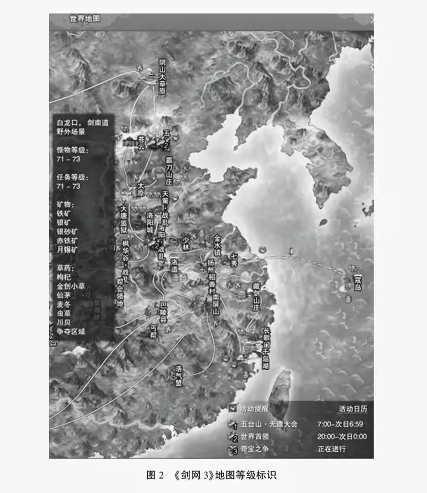 但在如今的開放世界游戲中,大多也保留著“升級”這一隱性導(dǎo)航機制。游戲設(shè)計者們也面臨著《龍與地下城》初版規(guī)則一般的疑問:如何在開放自由的世界與自主的玩家行為中,把握游戲的敘事節(jié)奏,平衡游戲難度?除卻鳳毛麟角的設(shè)計④,大部分“公式化開放世界”采用的仍然是升級導(dǎo)航機制,如《刺客信條·起源》與其后的系列作品,相對于《刺客信條》系列前作,似乎去除了隨劇情解鎖區(qū)域的限制,擁有全解鎖的地圖,顯得更加“開放”,但仍靠區(qū)域的怪物等級壓制,將玩家的行動軌跡圈定在角色等級允許的范圍內(nèi),生成相對線性的流程。與之類似的是網(wǎng)絡(luò)游戲,如《魔獸世界》《劍網(wǎng)3》等,網(wǎng)絡(luò)游戲往往也是一種開放世界游戲,擁有全開放的地圖與自主的玩家行為。但《魔獸世界》和《劍網(wǎng)3》均標(biāo)注出“地圖建議等級”,并以此延伸出官方的“建議升級流程”,在開放世界中用“升級”勾勒出線性的玩家行為軌跡。