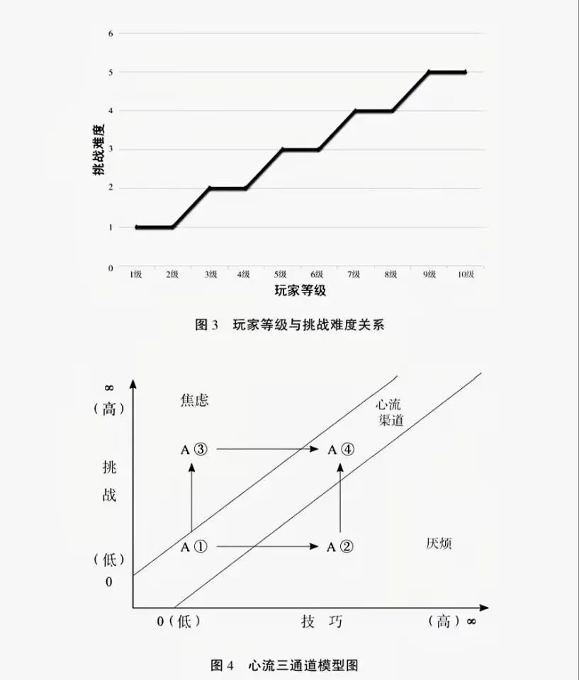 在游戲設(shè)計中,心流與升級機制息息相關(guān)。正如前文所論證的,在標(biāo)志升級機制成熟的《龍與地下城》游戲中,升級這一機制最開始是為了給DM調(diào)控遭遇戰(zhàn)難度,并更好地規(guī)劃出一條相對線性的游戲內(nèi)容。在強調(diào)技能程度和挑戰(zhàn)難度關(guān)系的心流理論中,升級機制起到了對這種關(guān)系進行“動態(tài)調(diào)控”的作用:玩家在升級后進入新地圖,敵人的難度對于玩家是高的、具有挑戰(zhàn)性的,隨著玩家戰(zhàn)斗經(jīng)驗的累積,玩家再度升級,自身能力提升,地圖中的敵人難度會相應(yīng)降低,此時往往會迎戰(zhàn)地圖關(guān)卡的高難度BOSS,戰(zhàn)后再度升級,進入新的等級地圖,從而進入一種階梯狀的難度循環(huán)。如果我們將這種玩家升級和難度體驗之間的關(guān)系畫出一幅折線圖,我們會發(fā)現(xiàn)它與心流理論的三通道模型圖非常相似——很多游戲正是利用升級,來保證玩家始終處于心流的體驗中。