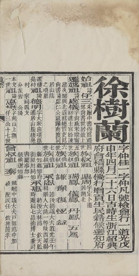 來新夏據(jù)薛炳所撰傳言其生于道光十七年(1837)(來新夏《辯是非》,第78頁),徐樹蘭曾孫女徐明浩亦言其生于道光十七年(1837)(紹興縣政協(xié)文史資料研究委員會《紹興文史資料》第3輯第48頁)。在學界,持此觀點的還有不少,如王河主編的《中國歷代藏書家辭典》、范鳳書的《中國私家藏書史》、顧志興的《浙江藏書史》、柳和城的《百年書人書樓隨筆》等。亦有認為其生于道光十八年(1838),如唐晶的《他們的國度》、李永鑫的《紹興通史》、唐力行的《江南文化百科全書》、尚磊明的《紹興碑刻文獻研究》。而《徐樹蘭鄉(xiāng)試朱卷》載其生于道光戊申年(1848)四月二十六日。