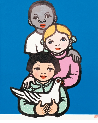 潘義奎《和平萬年》通過寫實手法,塑造齊白石創(chuàng)作中的姿態(tài),白石老人神態(tài)莊重而不失自然,正以奔放的筆觸勾勒一只和平鴿。蔣兆和《小孩與鴿》則通過現(xiàn)實主義的表現(xiàn)手法,展現(xiàn)孩童與鴿子之間的天真互動。這些作品都傳遞出人類對和平與幸福的期許。
