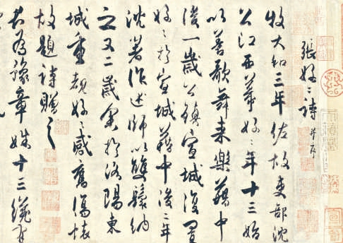 這是杜牧《張好好詩》中的句子,時(shí)唐大和九年(835年,原詩注似少寫一年)。宋徽宗將原帖收入內(nèi)府,《宣和書譜》稱:“(杜牧)作行草,氣格雄健,與其文章相表里。大抵書法至唐,自歐(詢)、虞(世南)、柳(公權(quán))、薛(稷)振起衰陋,故一時(shí)詞人墨客,落筆便有佳處,況如杜牧等輩耶?!?/p>
