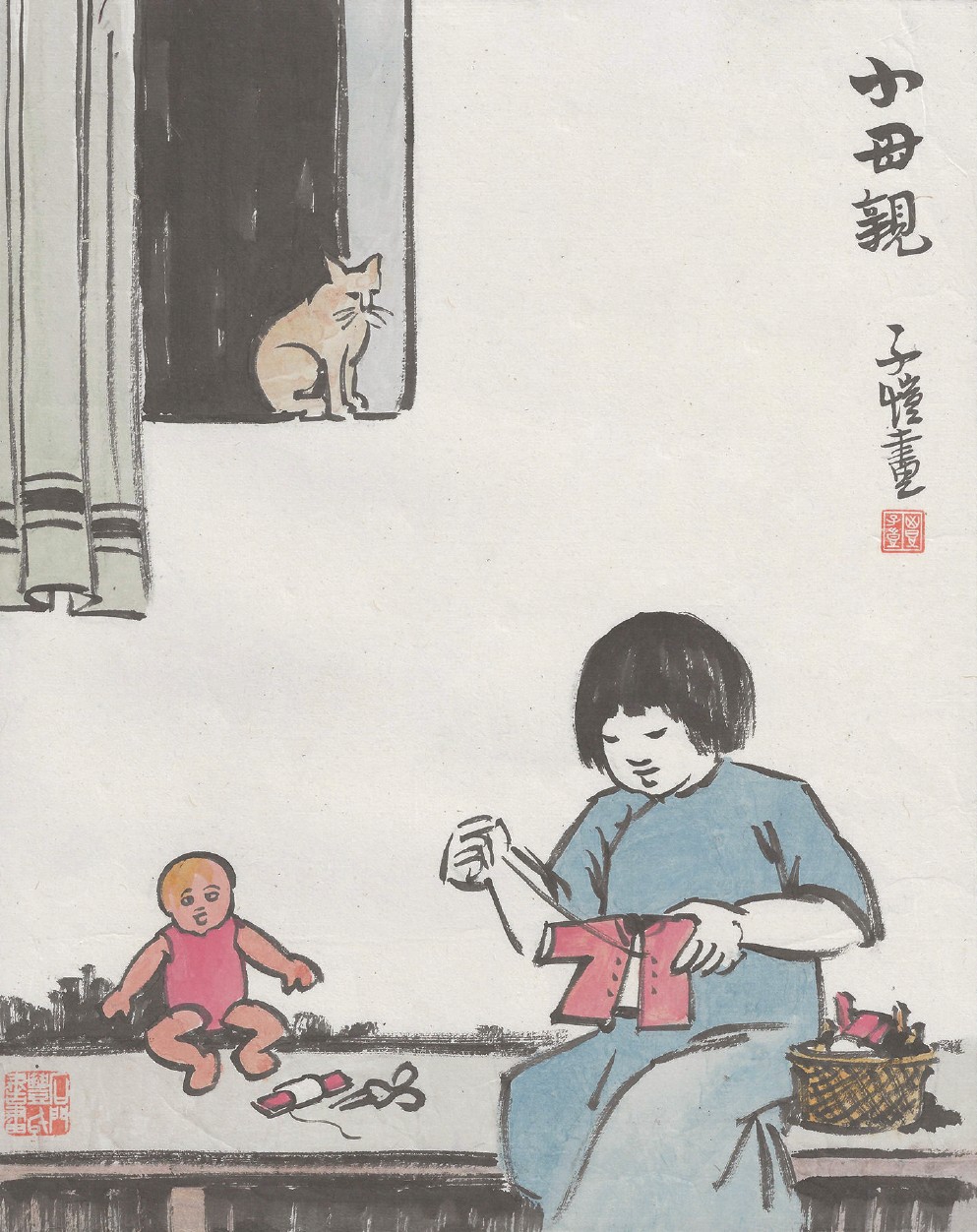 踱步于展廳,觀眾很難不被豐子愷眾多天真爛漫、溫暖人心的畫作所感染。例如,坐在窗邊、給布娃娃興致勃勃縫著小衣衫的女孩,被畫成了《小母親》;屋外挨個(gè)搬著小板凳、將它們排成列的小男孩,被畫成了《螞蟻搬家》;《夜花深處一燈歸》是雋永的剪影,聚焦夜色中提燈行走的兩姐妹;《梁上燕》以憑欄望向遠(yuǎn)方落花、飛燕的女子背影,予人無盡遐想……