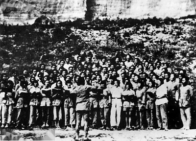 接下來,奇怪的一幕發(fā)生了:自討沒趣的保安隊的士兵不但沒有撤走,反而也和在場的青年們、和當(dāng)?shù)氐睦习傩找黄?,跟著冼星海一句一句地高聲唱了起來。不少人邊唱邊流淚,最后又情不自禁地高呼起了誓死抗戰(zhàn)到底的口號……