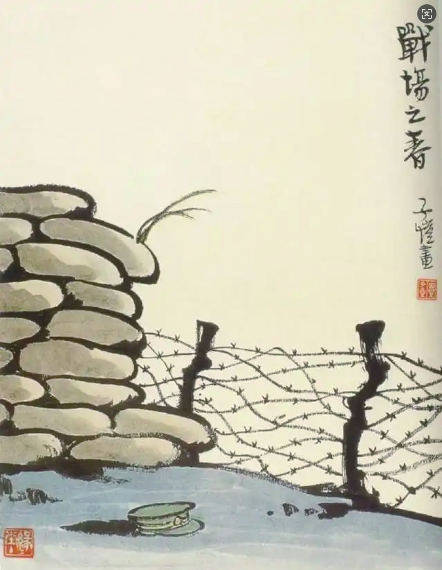 豐子愷堅信抗戰(zhàn)必勝,其漫畫作品灌注必勝的信念,充滿鼓舞人心的力量。他曾說:“古語云:‘眾志成城’,我們四百兆人團結(jié)所成的城,是任何種炮火所不得攻破的!”他的漫畫作品尺幅小,題材微,卻具有強烈的藝術(shù)感染力。比如《生機》和《戰(zhàn)場之春》,主角均為一株小草,纖細柔弱,一棵從灰暗的斷壁中探出頭來,一棵在冰冷的鐵絲網(wǎng)邊昂首向天,寥寥數(shù)筆,生機立現(xiàn)。《戰(zhàn)場之春》中題詩曰:“誰言爭戰(zhàn)地,春色渺難尋。小草生沙袋,慈祥天地心?!睔埧岬膽?zhàn)場上,小草頑強生長,印證著天地的慈祥之心,好生之德。