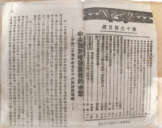 《共產(chǎn)黨人》是1939年10月在延安創(chuàng)辦的中共中央理論刊物,毛澤東為該刊題寫刊名“共產(chǎn)黨人”,并撰寫了發(fā)刊詞。雜志每月出版一期,總編輯為張聞天,編輯主任為李維漢,主旨為統(tǒng)一全黨思想、明確政治方向、鞏固黨的組織等?!豆伯a(chǎn)黨人》于1941年8月終刊,共出了19期。武光這本《共產(chǎn)黨人》就是第19期,扉頁(yè)上的“共產(chǎn)黨人”四個(gè)字極為顯著,左側(cè)印有“一九四一年八月出版”,目錄之后的首篇文章是《中央關(guān)于增強(qiáng)黨性的決定》。