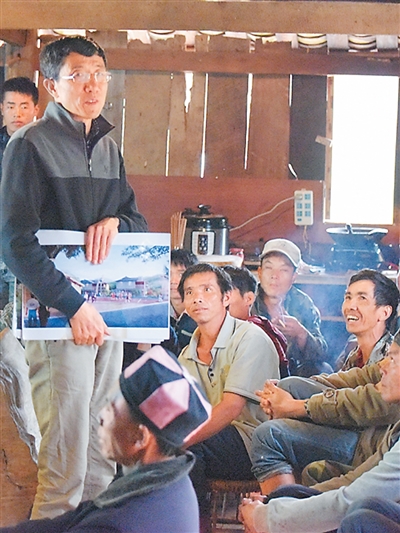 李小云教授(左)向村民展示項(xiàng)目規(guī)劃。