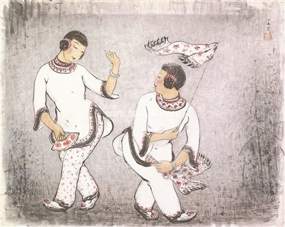 左側(cè)女子著白底紅花褲,梳雙發(fā)髻,左手拈蘭花指,手腕上的玉鐲很顯眼,右手持紅花折扇。右側(cè)女子右手執(zhí)幡,左手拿著長流蘇的紅花折扇。紅花、蘭花指和鐲子,讓人看到柔美、矜持和幸福。可以想象,起舞時(shí)裝飾與流蘇伴隨舞姿流轉(zhuǎn),幻化出多層流動(dòng)花海。