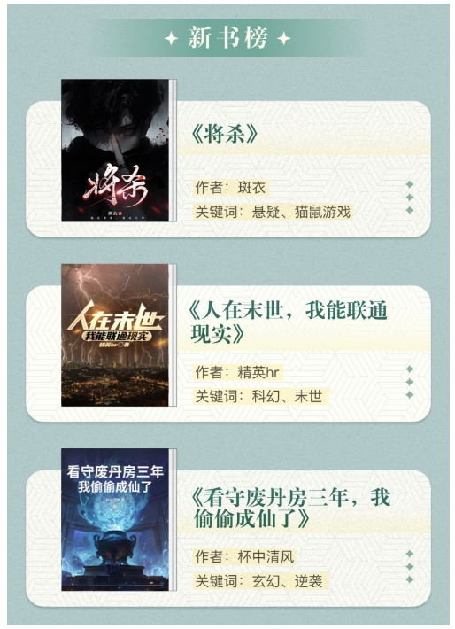 在新書榜中,三部新作使用了創(chuàng)新的敘事與結(jié)構(gòu)。懸疑探案作品《將殺》設(shè)定主角患上“間歇性失憶癥”形成“不可靠敘事”,引導(dǎo)讀者在反轉(zhuǎn)中重構(gòu)對(duì)人物與案件的認(rèn)知;《人在末世,我能聯(lián)通現(xiàn)實(shí)》以獨(dú)特的雙時(shí)空設(shè)定突破傳統(tǒng)末世題材的敘事窠臼,構(gòu)建出跨越十余年時(shí)空的協(xié)作與互助框架;《看守廢丹房三年,我偷偷成仙了》巧妙融合修仙元素與現(xiàn)代網(wǎng)文爽感邏輯,使故事呈現(xiàn)獨(dú)特節(jié)奏和層次感。