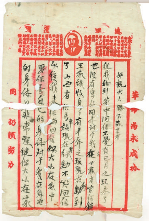 劉中新大概在上世紀二十年代末期參加紅軍,經(jīng)長征到達甘肅、陜北,后在八路軍115師政治部和343旅工作。據(jù)初步考證,此4封信分別寫于1937年9月7日和1938年6月至9月間。其中的第一封家書寫于山西侯馬,當(dāng)時紅軍剛剛改編為八路軍。1937年9月2日,115師由陜西三原出發(fā)進入山西境內(nèi),在侯馬稍作停留,即北上晉東北抗日前線,9月25日發(fā)起了平型關(guān)戰(zhàn)役。劉中新在這封家書中說:“從我接到家中回信,不覺已有月之久來了,也沒有寫信回來。對于我在甘肅省宮何鎮(zhèn)王家祿收(休)息了有半年之久,現(xiàn)在行動到了山西省侯馬車站?,F(xiàn)在要行動,不必回信,以后我來信再回信。你大小在家中要保養(yǎng)自己的身體,對于我在外面的身體是非常強健,你大小在家不必掛念……現(xiàn)在是全國動員抗戰(zhàn)的時非(候),我在外都是為了抗日救國,不能在家來孝順母親大人,以后回家再來孝順母親大人。現(xiàn)在我在國民革命軍第八路軍一百一十五師政治部工作……”