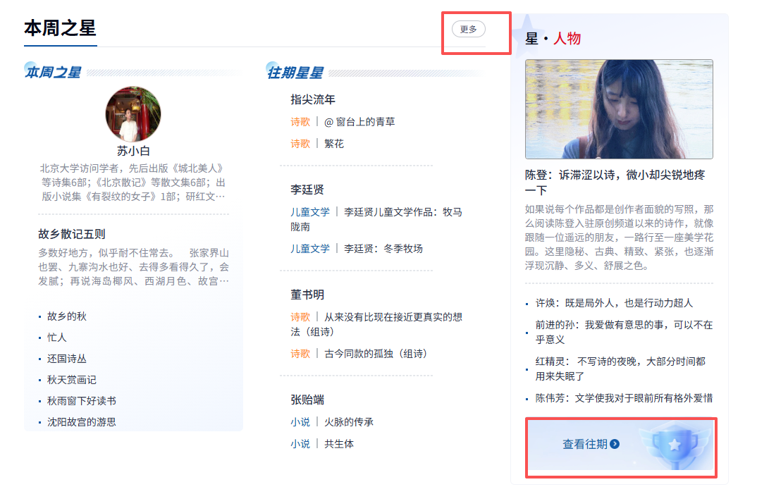 “本周之星”欄目的顯示內(nèi)容則變得更加豐富了,除了當(dāng)期的“本周之星”,也可以同步顯示往期的四位,點擊右上角“更多”進(jìn)入“本周之星”列表頁,查看所有“本周之星”內(nèi)容。