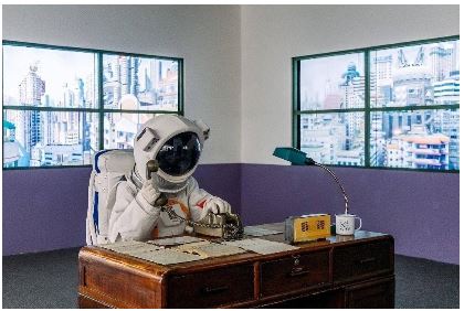 以20世紀(jì)90年代《科幻世界》編輯部為背景的“銀河編輯部”,宇航員正在打電話(huà)。圖為2023年“科幻世界·無(wú)限”宇宙之門(mén)超感科幻大展現(xiàn)場(chǎng)裝置。