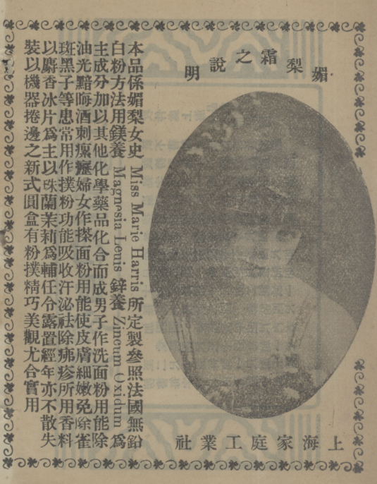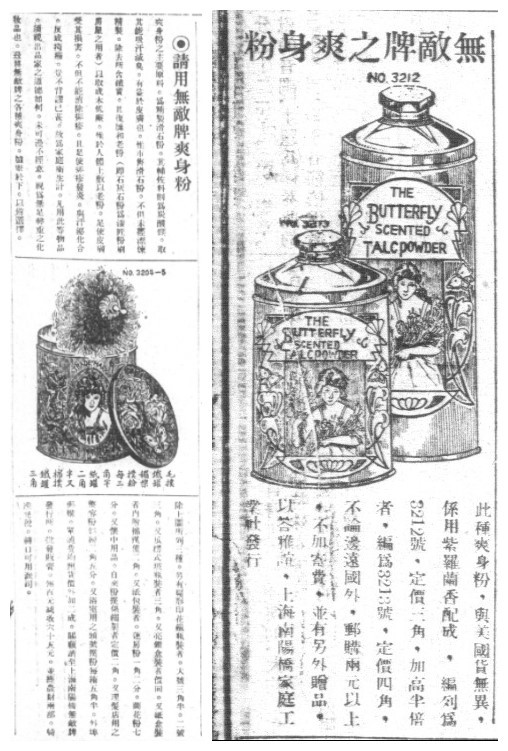 《紫羅蘭之優(yōu)待券》:瘦鵑生平,雅好紫羅蘭花,特囑天虛我生制成一種紫羅蘭之爽身粉,濃香艷美,無以復加,爰經家庭工業(yè)社擔任發(fā)行,以公同好,裝用蓮蓬式之美術鐵瓶,上印Miss Marie Harris女史之七色照相,美麗絕倫,仍以蝴蝶為商標,定名為(無敵牌爽身粉)The “Butterfly” Scented Talc Powder。每瓶定價三角,如憑此券向購,祗收七折,實洋二角一分,大號瓶高六寸,定價四角,七折減[祗]收二角八分,郵費另加,每單純費二角,可寄六瓶或大號四瓶,如寄十二瓶或大號八瓶,祗需郵費三角,惟邊遠倍費之處,照郵章加算。請與上海小西門新馬路家庭工業(yè)社或棋盤街著易堂購取可也。(1923年7月18日)