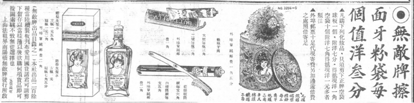 盡管家庭工業(yè)社積極在南洋開拓海外市場,但目前沒有材料表明其產品遠銷歐洲,因此“法國里昂”之說無從考證。有意思的是,以上材料將媚梨霜與以化妝品著稱的法國捆綁,不僅為家庭工業(yè)社營造出一種國際品牌的印象,更重要的還有稅收減免的政策紅利,這對一家正處于起步階段的企業(yè)來說,不可謂不重要,因此“媚梨女史”定制可能只是一種營銷的噱頭。其實《申報》早在前一年就刊登過媚梨霜的廣告,但是化妝盒身并沒有西洋女子的畫像(例如1921年10月4日),前述的國際化包裝或許是為了打開銷售局面才在后來推出的。