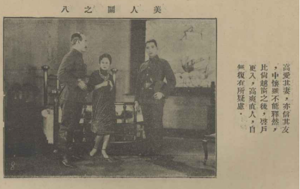 圖9 《美人關》劇照之一,展現高人杰、胡媚梨、尚劍帆的三角關系(圖片來源:《明星特刊》1928年第29期)