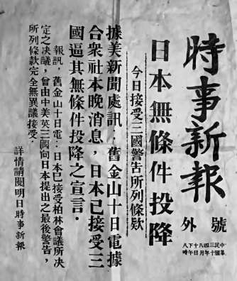 事實上,早在1945年8月10日,日本政府即已分別電請中立國瑞典、瑞士,將其投降之意愿轉達中、美、英、蘇四國,“日本政府決定無條件投降”的消息遂通過無線電波傳遍世界。當時,身處中國西南一隅的陳寅恪,究竟通過何種渠道獲知此訊,至今尚未見有確切的考證予以說明。不過,僅據(jù)筆者所知所見,抗戰(zhàn)期間將總部從上海遷至重慶的《時事新報》,確曾于1945年8月10日這一天下午印發(fā)過一份“號外”,日本無條件投降的消息,就赫然印于這份“號外”之上。當晚成渝兩地民眾可憑此“號外”,較早獲悉這一消息,確為事實。