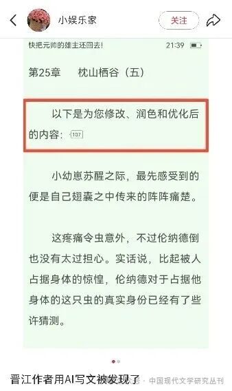 隨著大量AI生成作品的涌入,網(wǎng)絡(luò)文學場域的張力隨之被注入新的意義內(nèi)涵。一方面,或許讓·鮑德里亞早已為我們敲響了警鐘:“我們生活在一個信息越來越多,而意義卻越來越少的世界里?!盵12]利用人工智能大規(guī)模“水文”所帶來的內(nèi)容生態(tài)膨脹,使得各個網(wǎng)文平臺的作品“量”雖能迅速堆積,“質(zhì)”卻未必能與之齊頭并進,大量同質(zhì)化文本的涌現(xiàn)可能反而遮蔽了真正具有表達力與思想性的優(yōu)秀作品。晉江文學城、起點中文網(wǎng)等老牌網(wǎng)絡(luò)文學網(wǎng)站,雖有心進行防控,但面對投稿數(shù)量的指數(shù)級激增,現(xiàn)有的審核與篩選手段已顯捉襟見肘、防不勝防。晉江簽約作品《快把元帥的雄主還回去》的第25章“枕山棲谷”,其開篇竟明目張膽地保留了AI提示詞指令“以下是為您修改、潤色和優(yōu)化后的內(nèi)容”,引發(fā)讀者一片嘩然,目前該章節(jié)已被平臺鎖定。[13]起點中文網(wǎng)上同樣有例可循,其被收入精品頻道的小說《從小鎮(zhèn)做題家茍成大醫(yī)》(后更名為《醫(yī)療系學霸》)在第686章的結(jié)尾處,也出現(xiàn)了一段未被刪除的AI潤色指令。[14]除去這類“原汁原味”的AI生成痕跡以外,不少作品字里行間留下半遮半掩的“AI痕跡”。以晉江上架于2025年3月的簽約作品《予你心安》為例,文中主角徐以安將“馬克杯”摔進醫(yī)療廢物箱后,卻產(chǎn)生了“滿地青花瓷碎片”,隨后她又撿起地上的“玻璃”,物品材質(zhì)的矛盾明顯暴露出敘事邏輯的斷裂,這種常識性的錯誤恰恰是算法“抽卡”式寫作缺乏具身認知的典型表現(xiàn)?!傲訋膨?qū)逐良幣”的殘酷局面在番茄平臺顯現(xiàn)得尤為清晰。同樣以番茄平臺3月1日的首秀作品為例,“據(jù)網(wǎng)文大數(shù)據(jù),該期首秀中在讀漲幅超10萬的作品僅29本,在讀漲幅超30萬的‘爆款’為0。與之相對的是2月1日1569本新書首秀中,31本作品在讀漲幅超10萬,亦有4本在讀漲幅超30萬”[15]??梢姡珹I介入之下網(wǎng)文的規(guī)模性涌入并未帶來“爆款”的增長,反而使得真正有潛力的作品被大量平庸文本所淹沒。更令人憂慮的是,AI寫作的普及也使得“文本剽竊”出現(xiàn)了新的形態(tài)。早在2021年3月,就已有業(yè)內(nèi)人士表示,“有的作者利用自動寫作軟件,將大量已有作品的文字內(nèi)容復(fù)制拼湊到自己的小說中,再通過對他人作品進行語序調(diào)整、同義詞替換等表達方式的轉(zhuǎn)換,實現(xiàn)‘洗稿’”[16]。