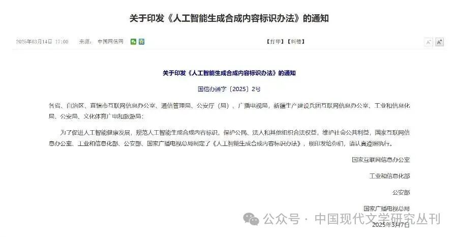 中國網(wǎng)信網(wǎng)發(fā)布《關(guān)于印發(fā)〈人工智能生成合成內(nèi)容標識辦法〉的通知》