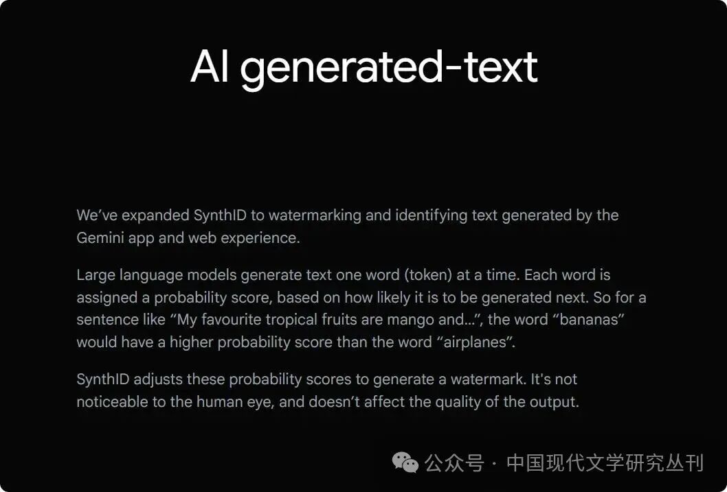 在創(chuàng)作規(guī)范日漸達成共識之后,如何有效識別并管控AI參與網(wǎng)文創(chuàng)作,就成為平臺和作者共同面臨的下一道難題。令人意外的是,相比于慶幸各個網(wǎng)文平臺出臺的管控舉措使之在“人機對抗”中扳回一城,網(wǎng)文原創(chuàng)作者們更關(guān)切的其實是AI識別的可行性,以及由此帶來的潛在風險。例如,在晉江宣布AI參與創(chuàng)作的界限之后,該公告的討論區(qū)里不乏“真的不會誤判造成冤假錯案么?那些鑒定都不太靠譜,有點憂慮”[30]之類的質(zhì)疑聲。由此可見,AI創(chuàng)作浪潮中核心矛盾的指向,已經(jīng)悄然轉(zhuǎn)向?qū)I檢測技術(shù)信度的懷疑。當前,用于文本類內(nèi)容檢測的AI識別技術(shù),主要可分為兩大類:一類是從結(jié)果出發(fā),即通過AI檢測工具識別文本中可能的“AI味”;另一類則是從源頭入手,在AI文本生成的過程中嵌入某種“水印”標識,用以追蹤與鑒別。當前AI生成文本雖已能夠自如地模擬自然語言,但在涉及長文本的內(nèi)容生成任務(wù)中,其語言構(gòu)成依然表現(xiàn)出一定的傾向性,比如高頻詞語的固定化選擇、句式結(jié)構(gòu)過于工整、語義邏輯的突然跳躍等。這些細節(jié)通常不容易為人眼所察覺,但訓練有素的大模型卻可以在“統(tǒng)計”層面發(fā)現(xiàn)這些“非人類”的規(guī)律。以騰訊公司于2025年1月推出的“朱雀大模型檢測”為例,其在官方網(wǎng)頁中介紹,“文本檢測中,LLM通常以低困惑度和突發(fā)性編寫文本”,因此朱雀在經(jīng)過使用“海量AI生成的數(shù)據(jù)和真實數(shù)據(jù)進行模型訓練”后,可通過先進的文本檢測算法等進行文本的識別與鑒定。[31]然而,這類檢測存在局限性。朱雀在其頁面介紹中就明確指出,在人類語言系統(tǒng)中廣泛存在著通用表達方式與結(jié)構(gòu)化寫作規(guī)范,為AI的學習模仿提供了天然土壤,這一特性在網(wǎng)絡(luò)文學等特定文體中表現(xiàn)得尤為顯著。在處理這類文本時,“由于AI生成的文本和人類創(chuàng)作的文本在語言、情節(jié)結(jié)構(gòu)上非常相似,這極大地增加了檢測難度,極易引發(fā)誤報”[32]。另一類“水印”式檢測技術(shù),即指在保持可讀性與流暢性的前提下,在文本生成階段就有意嵌入非扭曲水印,為其烙上“看不見的指紋”。Google DeepMind團隊開發(fā)的SynthID-Text工具,就是這一領(lǐng)域的代表性探索成果之一,且已成功應(yīng)用于Gemini和Gemini Advanced等系統(tǒng)。[33]值得一提的是,這類檢測技術(shù)并不依賴于外部語料的比對,因而具有更強的可追溯性。不過,它也并非萬全之策。只有當生成的文本未被人為二次干預(yù)時,植入的水印才能保持完整。但在實際的網(wǎng)文創(chuàng)作過程中,即使選擇使用人工智能進行輔助,大部分寫手也會對生成內(nèi)容進行校正、修改等,水印的可識別性很容易被破壞。除此之外,考慮到各類人工智能大模型的權(quán)限問題,這類檢測技術(shù)尚未能實現(xiàn)大規(guī)模的部署和應(yīng)用。不論如何,這兩類AI文本檢測工具在其設(shè)計邏輯上,本身就包含著一種自反性的悖論,它們的有效性始終依賴于AI自身的不夠好。一旦AI足夠聰明,可以模仿甚至反向預(yù)測檢測技術(shù)的運作邏輯,那么后者將很快失效。