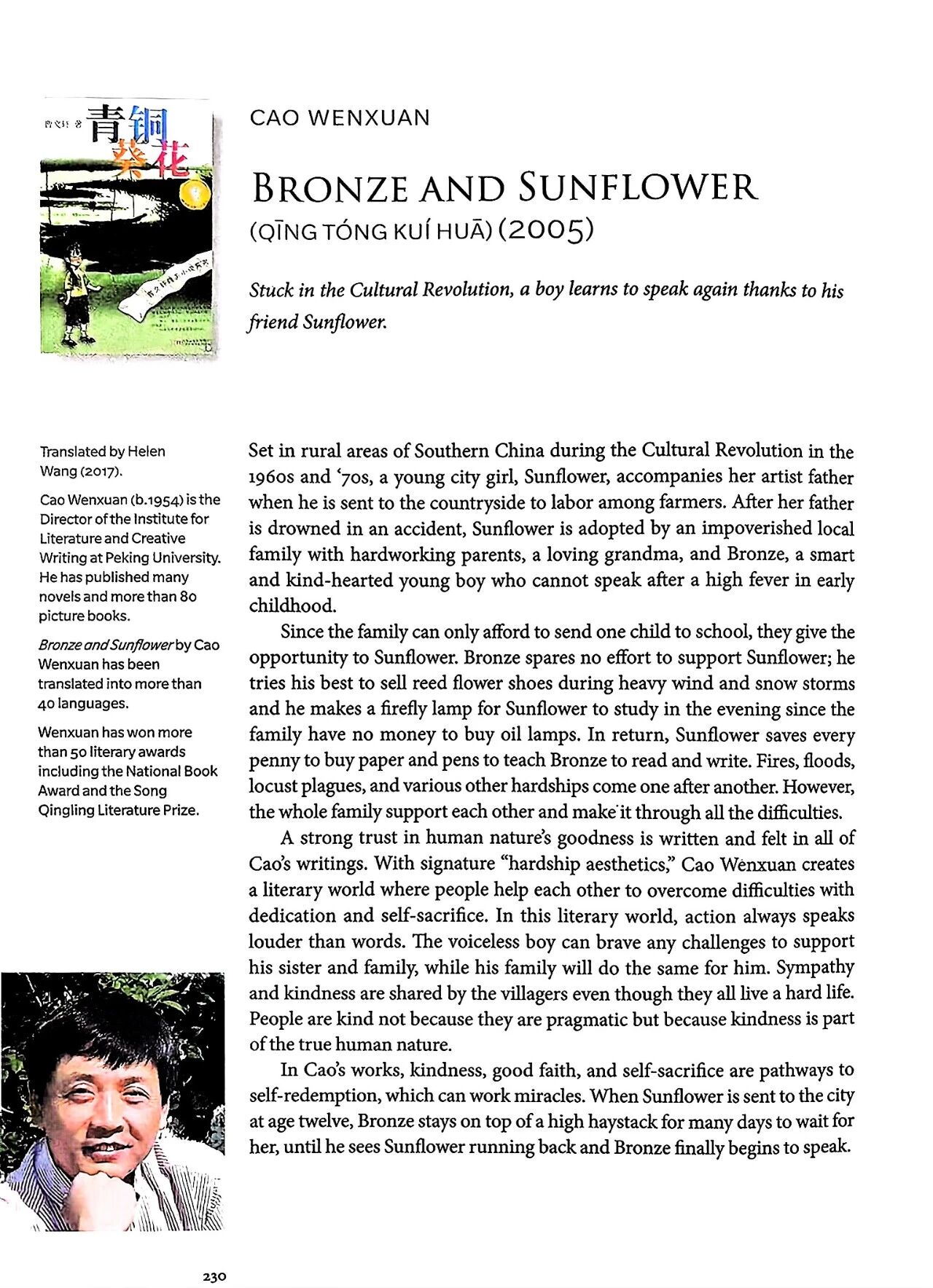 出版于2005年的《青銅葵花》講述了中國鄉(xiāng)村特殊年代下農(nóng)村男孩青銅與城市女孩葵花之間誠摯純真的兄妹情誼,飽含著“詩意的苦難”與人性的溫情,《奇跡的世界》中該詞條的撰寫者徐德榮教授這樣概括道:“在曹文軒的作品中,善良、誠信與自我犧牲是通往自我救贖的途徑,能夠創(chuàng)造奇跡?!倍赀^去了,這份來自中國的“奇跡”正在世界范圍內(nèi)撫慰著越來越多的孩子,截至2025年8月,作品已被譯為26種語言,出版36個版本,從英,法,德,日,意大利語、阿拉伯語等各大語種,到斯瓦希里文、僧伽羅文等,全世界的孩子正在被蘆花鞋和冰項鏈的故事所深深感動著。