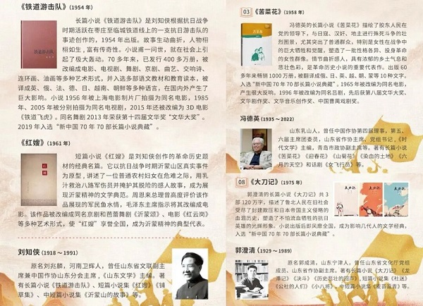 社會主義革命和建設時期,山東抗戰(zhàn)文學抒寫歷史記憶的文學重構。劉知俠穿越敵人封鎖線深入魯南,和游擊隊員一起戰(zhàn)斗和生活,搜集了大量創(chuàng)作素材,推出長篇小說《鐵道游擊隊》。70多年來,已發(fā)行400多萬冊,被改編成電影、電視劇、舞劇、京劇、曲藝、交響詩、連環(huán)畫、油畫等多種藝術形式,并入選多部語文教材和教育讀本,被譯成英、俄、法、德、日、越南、朝鮮等多種語言,在國內外產生巨大影響。馮德英的長篇小說《苦菜花》是革命小說的重要代表作,1956年被改編為同名電影,1996年被改編為同名呂劇,先后獲第八屆文華大獎、文華劇作獎、文化音樂創(chuàng)作獎、中國曹禺戲劇獎。郭澄清的長篇小說《大刀記》出版后即風靡全國,成為影響一代人的紅色經典。這3部作品2019年同時入選“新中國70年70部長篇小說典藏”。邱勛的中篇小說《微山湖上》獲1980年第二次全國少年兒童文藝創(chuàng)作評獎二等獎。李心田的中篇小說《兩個小八路》2018年被列入中宣部“優(yōu)秀青少年讀物工程”推薦書單。還有翟永瑚的小說《民兵爆炸隊》,賽時禮的小說《三進山城》、峻青的小說《馬石山上》等一大批優(yōu)秀作品,描繪了一幅波瀾壯闊的齊魯大地軍民浴血抗戰(zhàn)的全景圖,展現(xiàn)了抗戰(zhàn)時期山東人民的英雄氣概與家國情懷。