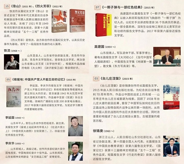 中國特色社會主義新時代以來,山東抗戰(zhàn)文學抒寫呈現(xiàn)多元視角與精神傳承。鐵流的長篇紀實文學《靠山》全景式呈現(xiàn)了革命年代人民群眾踴躍支前的動人場面,獲第十六屆精神文明建設“五個一工程”優(yōu)秀作品獎。李延國、李慶華的長篇紀實文學《根據地:中國共產黨人不能忘卻的記憶》被中宣部《黨建》雜志全文轉載,獲第六屆徐遲報告文學獎,成為黨史學習教育的重要輔導讀物。高建國的長篇紀實文學《一顆子彈與一部紅色經典》獲第六屆徐遲報告文學獎。還有徐錦庚的報告文學《臺兒莊涅槃》、趙德發(fā)的長篇小說《大海風》、楊文學的長篇紀實文學《百年沂蒙》等一系列優(yōu)秀作品,真實反映了山東地區(qū)軍民的戰(zhàn)斗生活,以文學的方式深入全民抗戰(zhàn)的歷史,續(xù)寫了抗戰(zhàn)題材文學創(chuàng)作的嶄新篇章。
