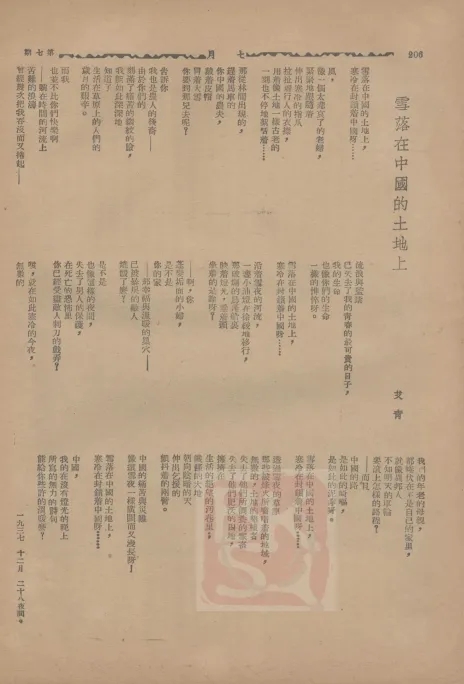 艾青:《雪落在中國的土地上》,《七月》1938年第7期