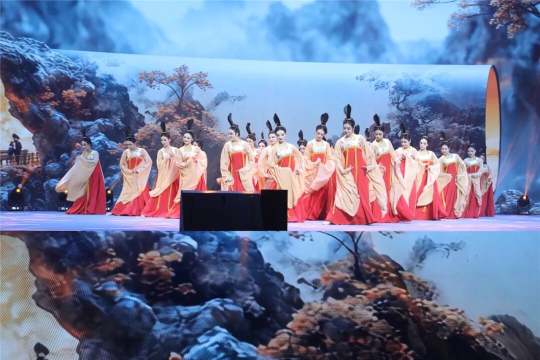 “春江潮水連海平,海上明月共潮生。滟滟隨波千萬(wàn)里,何處春江無(wú)月明?!卑殡S著唐代詩(shī)人張若虛名篇《春江花月夜》中的詩(shī)句,2025國(guó)際青春詩(shī)會(huì)開(kāi)幕式徐徐拉開(kāi)帷幕。20余位舞者梳著高髻,身著中晚唐時(shí)流行的鵝黃寬袖對(duì)襟衫、朱砂曳地襦裙,在優(yōu)美的音樂(lè)聲中緩步上臺(tái),將扮演詩(shī)人的舞者圍在舞臺(tái)中央。衣袂翻飛,劍舞翩然。春江月色中,舞者們身姿流轉(zhuǎn),恰似江潮連海的壯闊;氣韻澄明,宛若明月共生的浩渺。舞臺(tái)上展現(xiàn)出一幅詩(shī)言志、歌詠聲、舞動(dòng)容的長(zhǎng)安盛景。