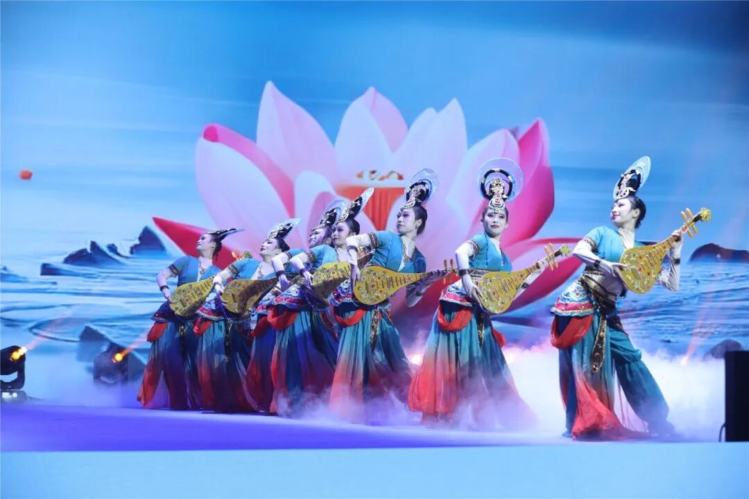 如果說(shuō)《天下朋友》演繹的是一出熱忱好客的迎賓曲,那么唐代詩(shī)人白居易《琵琶行》開(kāi)篇“主人下馬客在船”表達(dá)的就是一份希望遠(yuǎn)方賓朋多留片刻的真摯情感。千年之前,白居易到潯陽(yáng)江邊送客,因江面上傳來(lái)一陣琵琶聲留住歸程,也成就了“音樂(lè)詩(shī)中的千古絕唱”?!讹L(fēng)起東方》旋律響起,十余位舞者身著初唐時(shí)期較為普遍的雞心領(lǐng)短襦和青色合歡袴,手持金色琵琶,在舞臺(tái)上翩翩起舞。在舞蹈節(jié)目《琵琶行》中,舞者們迎風(fēng)擺動(dòng)的衣裙,飄飄翻卷的彩帶,仿若從盛唐時(shí)期敦煌莫高窟的飛天圖壁畫(huà)中走出來(lái),走進(jìn)不夜長(zhǎng)安的詩(shī)歌狂歡。弦音流轉(zhuǎn)間,“嘈嘈切切錯(cuò)雜彈,大珠小珠落玉盤(pán)”的意韻猶在;琵琶聲聲響,傳遞出跨越山海的詩(shī)意和鳴。