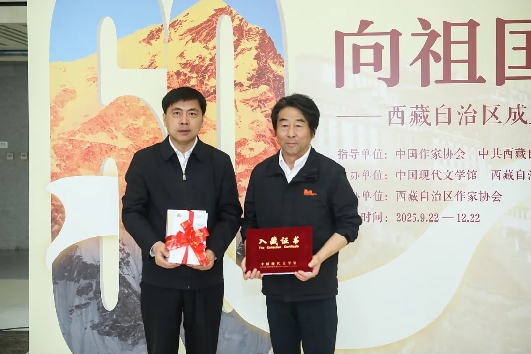 開幕式現(xiàn)場,扎西達娃代表西藏自治區(qū)文聯(lián)向中國現(xiàn)代文學(xué)館捐贈圖書,中國現(xiàn)代文學(xué)館常務(wù)副館長王軍接受捐贈。