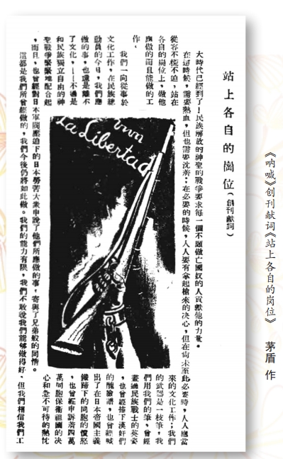 在籌備階段,茅盾因在文學(xué)界的崇高地位而備受《吶喊》籌備組眾人的信賴,主動承擔(dān)了《吶喊》的早期主編工作和發(fā)起責(zé)任。在創(chuàng)刊號中,他發(fā)表了《站上各自的崗位》一文,疾呼:“大時代已經(jīng)到了!民族解放的神圣的戰(zhàn)爭要求每一個不愿做亡國奴的人貢獻(xiàn)他的力量?!痹谖恼轮兴麖娬{(diào),非常時期的文學(xué)工作者應(yīng)該承擔(dān)責(zé)任,保持沉著,他號召大家“站在各自的崗位上,做他應(yīng)做的而且能做的工作”??锔?,他又在《烽火》創(chuàng)刊號中用《戰(zhàn)神在嘆氣》一文,犀利抨擊日軍的狂妄與殘暴:“你不是說過么,滅亡你的鄰邦只要二十四小時?……原來你只會嚇一些軟骨頭的‘恐日病者’,你一向只會夸嘴!”以此表達(dá)對侵華日軍的憤怒與不屑。雖然茅盾先生后來因戰(zhàn)局惡化被迫離開上海,但他沒有放棄寫作,仍然堅持向《烽火》寄回他在流轉(zhuǎn)途中創(chuàng)作的散文、短論及報告文學(xué),真實記錄戰(zhàn)爭苦難與民眾抗?fàn)?,為抗?zhàn)時期的文藝事業(yè)留下了一批珍貴文獻(xiàn)。