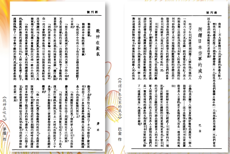 同樣不可忽視的是巴金在《烽火》出版過程中的關(guān)鍵作用。作為《吶喊》和《烽火》的聯(lián)合創(chuàng)刊人之一,巴金不僅全程參與了從《吶喊》到《烽火》的編輯出版工作,更是從《烽火》第六期開始接任了茅盾的主編任務(wù)。在戰(zhàn)火紛飛、出版條件極其困難的情況下,巴金始終堅持組稿和撰寫文章,甚至為了確保了刊物的持續(xù)出版,他隨身攜帶未刊稿件,輾轉(zhuǎn)于中國南方地區(qū)躲避戰(zhàn)爭并隨時尋找機會進(jìn)行刊印。巴金的文學(xué)創(chuàng)作一直以直面現(xiàn)實、情感熾烈和附有批判性而著稱,在為刊物供稿的過程中,他將個人情感與民族命運緊密結(jié)合,用文字向社會傳達(dá)了人民的處境和心聲。1937年8月28日,日軍轟炸上海南站,造成大量平民傷亡,巴金憤慨萬分,提筆撰寫了《所謂日本空軍的威力》一文發(fā)表在《烽火》上,嚴(yán)詞譴責(zé)日軍:“這不是戰(zhàn)爭,這是謀殺!日本空軍展露給世界人士看的,并不是它的威力,而是一種虐他性的瘋狂!”他將日軍稱為“一群沒有理性的渴血生物”,以此來表達(dá)他作為中國人的憤怒和作為一名作家的良知。據(jù)重慶師范大學(xué)統(tǒng)計,巴金先后在《吶喊》與《烽火》上發(fā)表各類作品30余篇,體裁涵蓋雜文、小說、詩歌與譯作,是《吶喊》和《烽火》供稿最多、影響最大的核心作者之一。